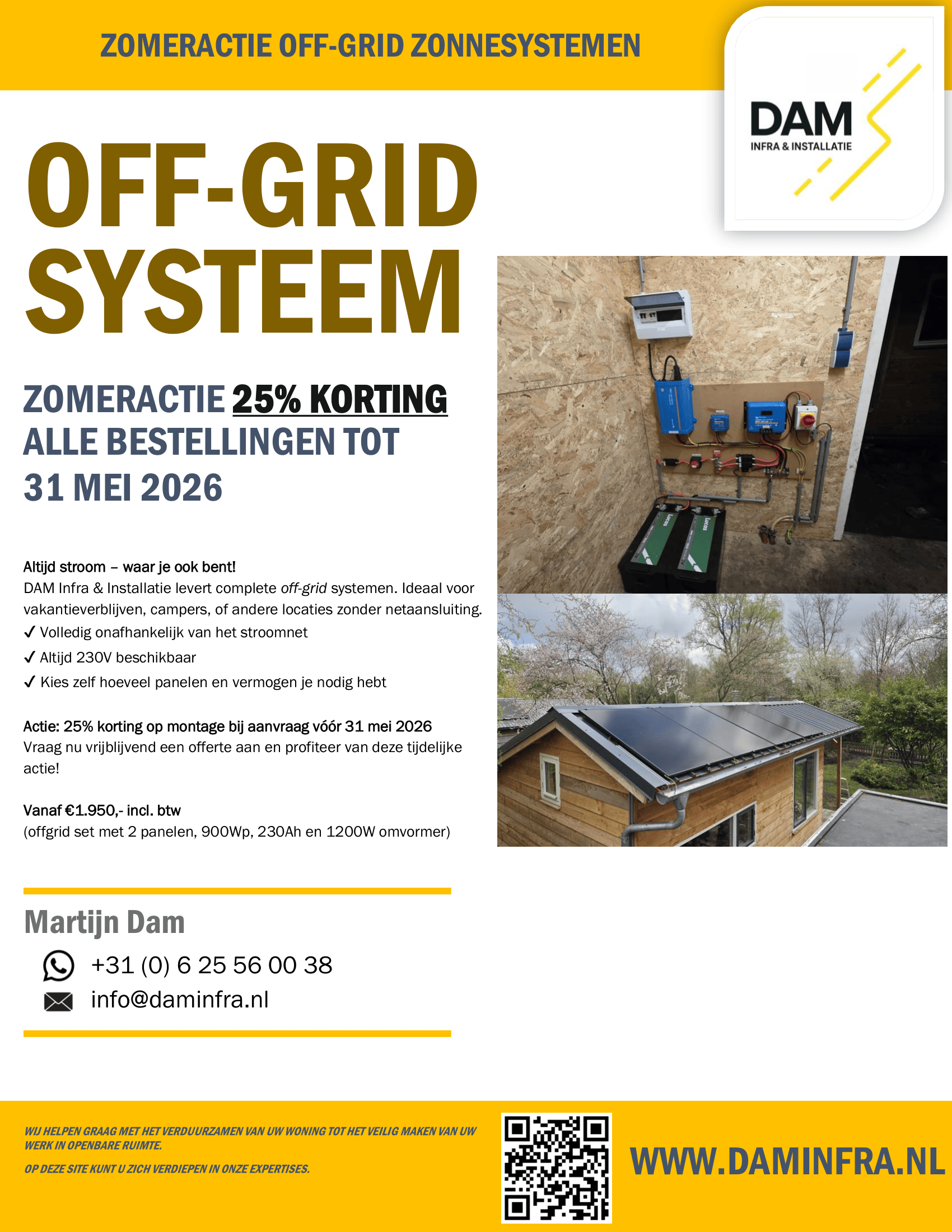 DAM Infra en Installatie is gespecialiseerd in installatietechniek in Drachten, infratechniek in Friesland, off-grid energiesystemen en elektrotechniek in Noord-Nederland.